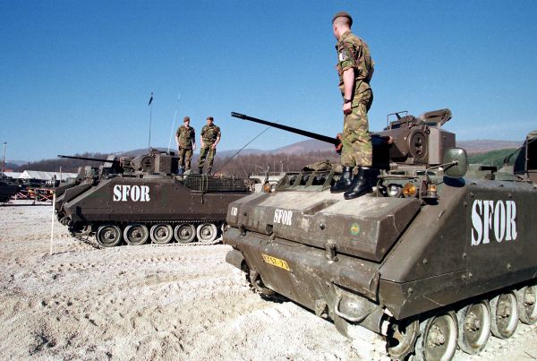 Nederlandse militairen van SFOR in Bosnië. Militairen in Afghanistan die de vergelijking met Bosnië konden maken, ervaarden dat ze in Afghanistan wél de juiste middelen en duidelijkheid hadden. Foto Beeldbank NIMH