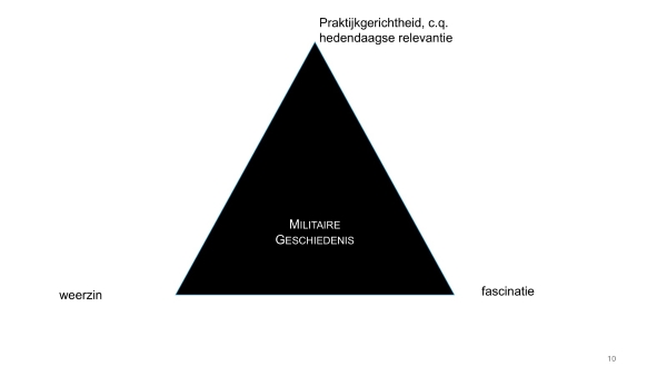 Vanuit elk van deze drie polen – wellicht het best kort samen te vatten als weerzin, fascinatie en praktijkgerichtheid – doet het vakgebied zich anders voor en ziet ook het kenobject er anders uit. Net als oorlog heeft ook militaire geschiedenis een kameleontisch karakter. Juist het spanningsveld tussen deze polen leidt echter tot de interessante vragen, en alleen samen kunnen ze helpen het verschijnsel oorlog en de menselijke omgang ermee, te doorgronden en te duiden.