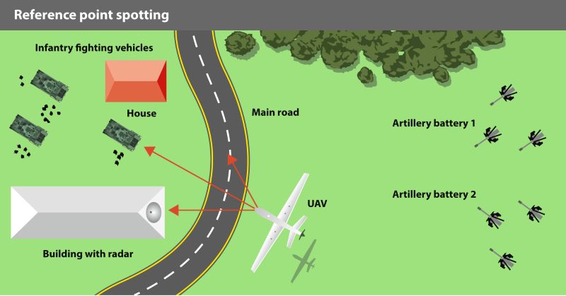 Figuur 3 Target Acquisition met gebruik van referentiepunten. Gebaseerd op S. Cranny-Evans, Eyes in the sky: How the Orlan-10 UAV is shaping Russian Artillery operations, Jane’s Defence Insight Report, 2020