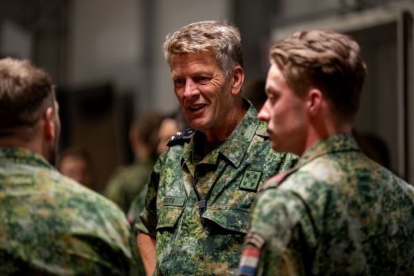 Inspecteur-Generaal der Krijgsmacht viceadmiraal Boudewijn Boots in gesprek met Nederlandse militairen bij een werkbezoek in Litouwen. Foto Ministerie van Defensie