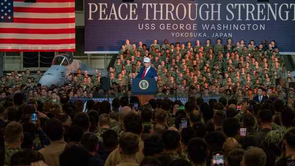 De Amerikaanse president Donald Trump houdt een toespraak op de bij Yokosuka afgemeerde carrier USS George Washington, oktober 2025. Foto US Navy, Bruce Morgan