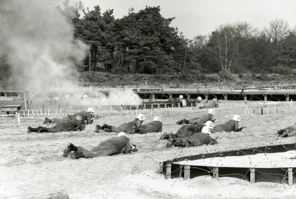 Een peloton op de gevechtsbaan van het Infanterie Schietkamp. Foto Beeldbank NIMH