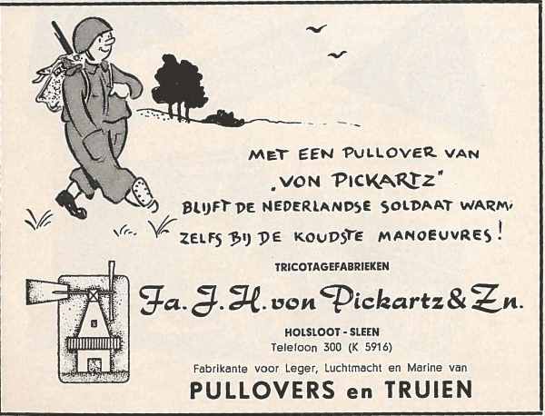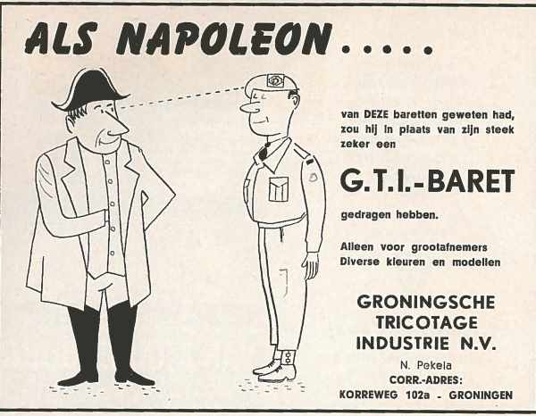 Er waren ook advertenties met een kwinkslag, zoals het optreden van Napoleon in een reclame voor G.T.I.-baretten, Jan Soldaat in een warme pullover van Von Pickartz & Zn of het lampenbedrijf Hiemstra Evolux, dat zichzelf een lintje toekende voor ‘bijzondere krijgsverlichtingen’.