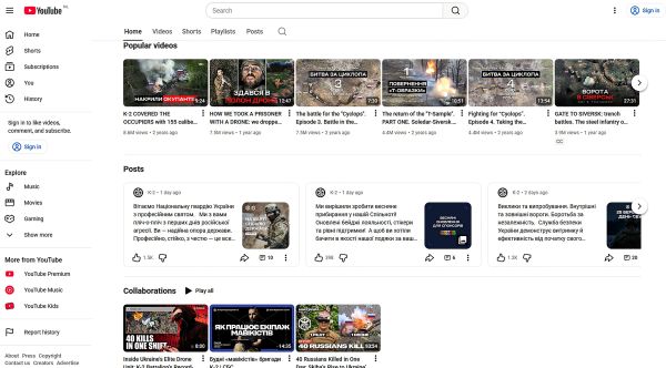 Het YouTube-kanaal van de K-2-brigade. Dit kanaal fungeert als platform voor frontverslaggeving, fondsenwerving en rekrutering. Drones leveren constant beeldmateriaal dat strategisch wordt ingezet om successen vast te leggen, narratieven te sturen en nationale trots te versterken. Foto YouTube
