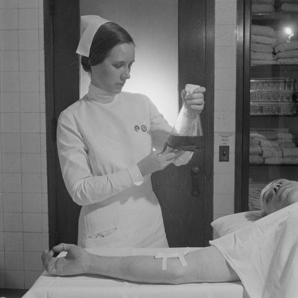 Een Amerikaanse verpleegkundige zwenkt een fles met bloed ten behoeve van transfusie (1942). Direct na afname moest het bloed in beweging blijven om stolling te voorkomen. Foto Library of Congress