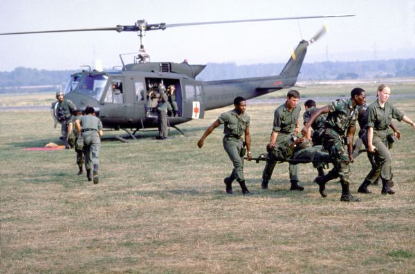 Medics oefenen het vervoer naar een MASH vanuit een UH-1 Iroquois MEDEVAC-helikopter. De ontwikkeling van helikopters en mobiele veldhospitalen verkortte de tijd en verkleinde de afstand tussen de gewonde en de eerste chirurgische ingreep. Foto U.S. Department of Defense